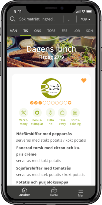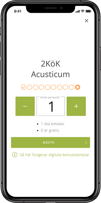 Genom att samla digitala bonusstämplar när du köper lunch på någon av lunchrestaurangerna som erbjuder digitala bonusstämplar på Mat och Mat så kan du få var 10:e lunch gratis. Och det är hur enkelt som helst! För tillfället finns möjligheten att få digitala bonusstämplar i utvalda städer hos de restauranger som erbjuder detta. Om restaurangen erbjuder detta visas 10 st orangea ringar under restaurangens logotype i lunchlistan.